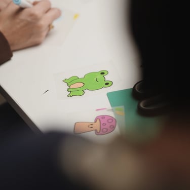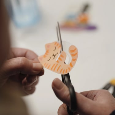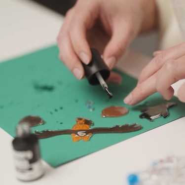 Charms’ų gamybai naudojame specialų plastiką, ant kurio piešiame, karpome, o vėliau kaitinant jis susitraukia, pastorėja ir virsta tvirtu, mažu objektu. Tai vienas iš tų procesų, kuriame kūryba turi netikėtumo – piešinys pasikeičia akyse, o rezultatas visada šiek tiek nustebina. Čia daug žaidimo, smalsumo ir leidimo sau neplanuoti iki galo.
