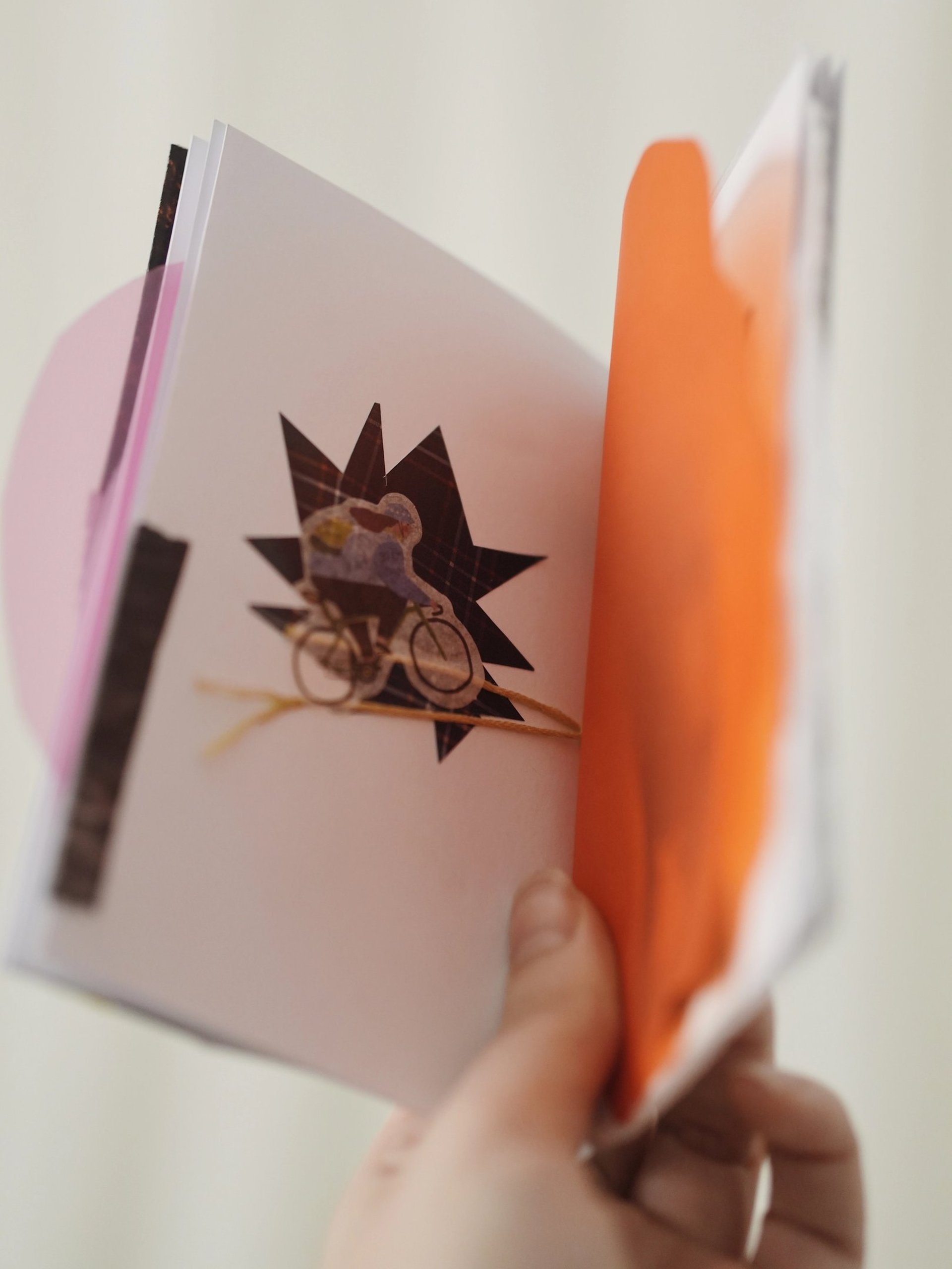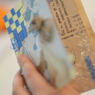 Būrelio metu kuriam atskirus puslapius – sluoksniuojam iškarpas, tekstus, spalvas, fragmentus. Kai lapai paruošti, mokomės paprasto, bet labai estetiško rišimo būdo ir viską sujungiame į vieną zine formato knygelę.