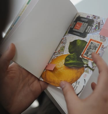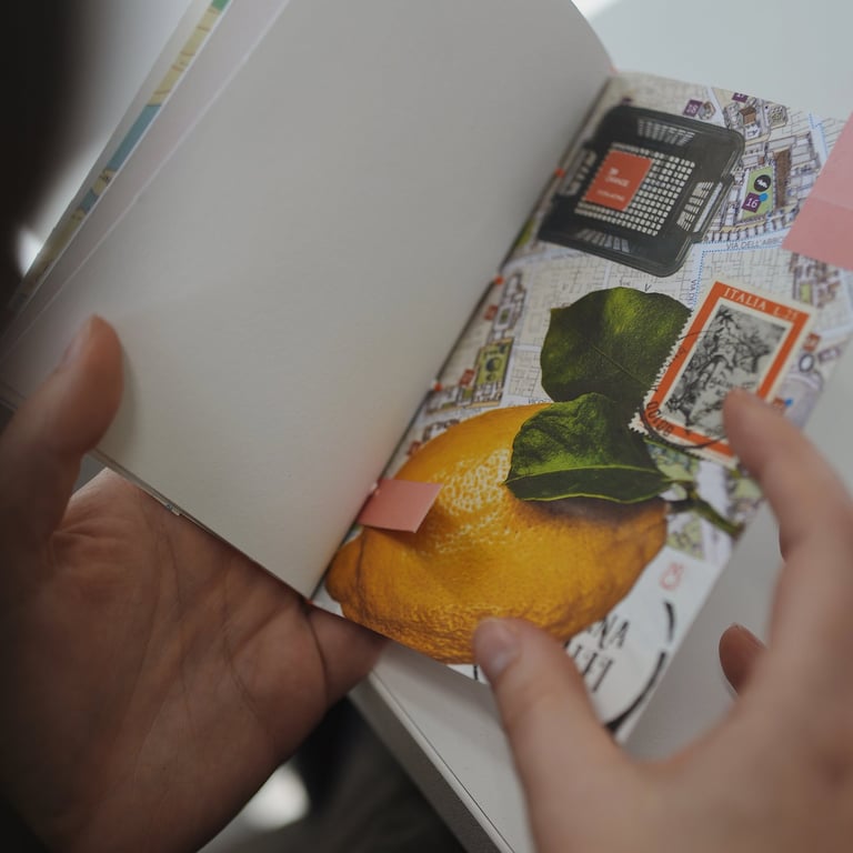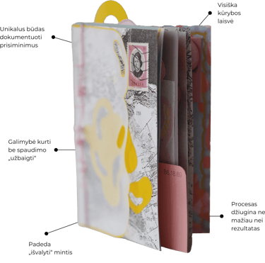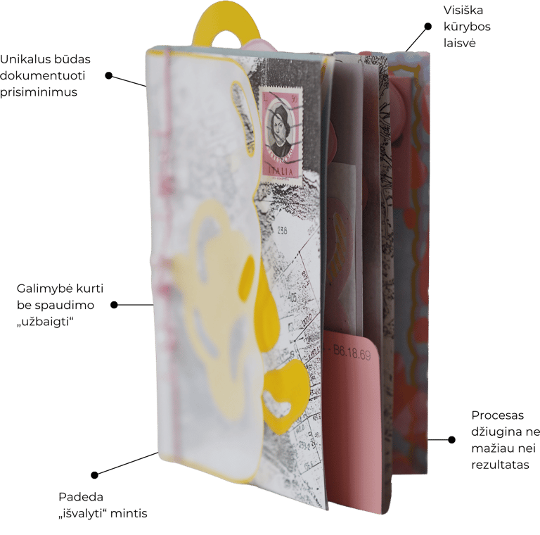 Nebūtina per vieną vakarą užpildyti visos knygutės. Gali susikurti kelis puslapius ar viršelį, o likusius lapus pripildyti vėliau – kelionių įspūdžiais, koncertų bilietais, vakarėlių polaroidais ar mintimis, kurios gimsta tarp eilučių.