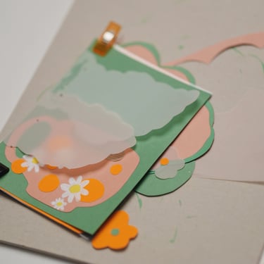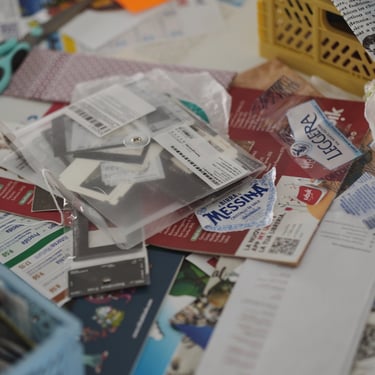 Būrelis, kuriame iš popieriaus, iškarpų ir smulkių detalių ant medinės lentelės gimsta unikalūs koliažai.