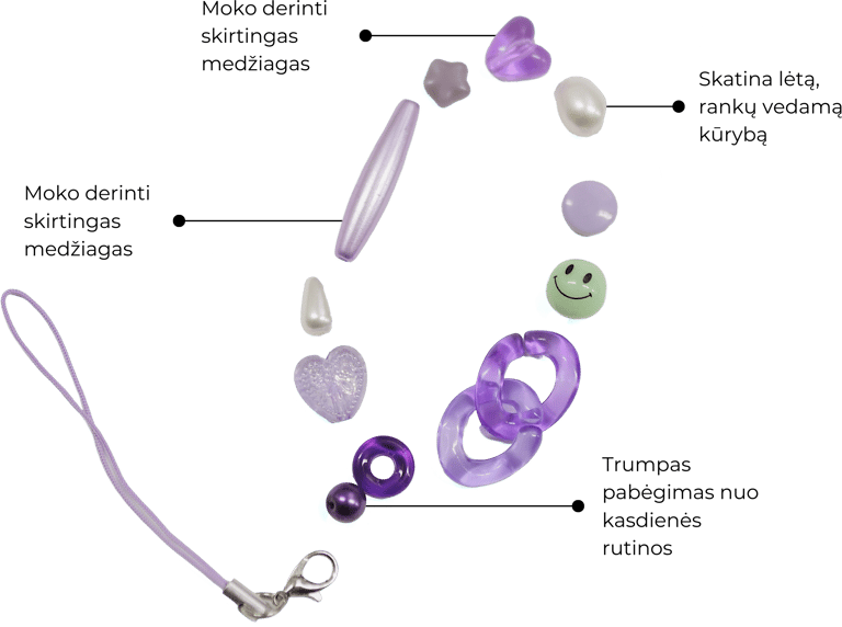 Telefonų pakabuko gamyba – tai procesas, kuriame daug sprendimų gimsta eigoje. Nėra vieno teisingo būdo, todėl kiekvienas pakabukas išeina skirtingas. Tai būrelis apie jungimą: detalių, technikų ir ankstesnių kūrinių. Jei turi savo pagamintą charmsą, jį visada galima įkomponuoti į pakabuką ir suteikti jam naują gyvenimą. Taip kūryba tampa tęstinė, o daiktai pradeda „kalbėtis“ tarpusavyje.