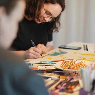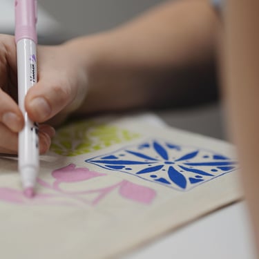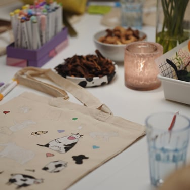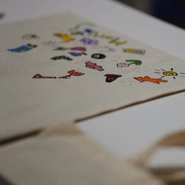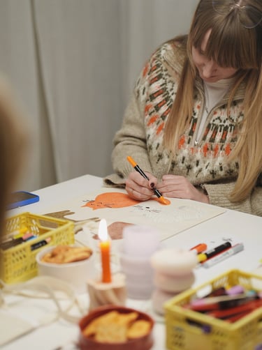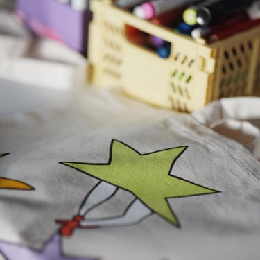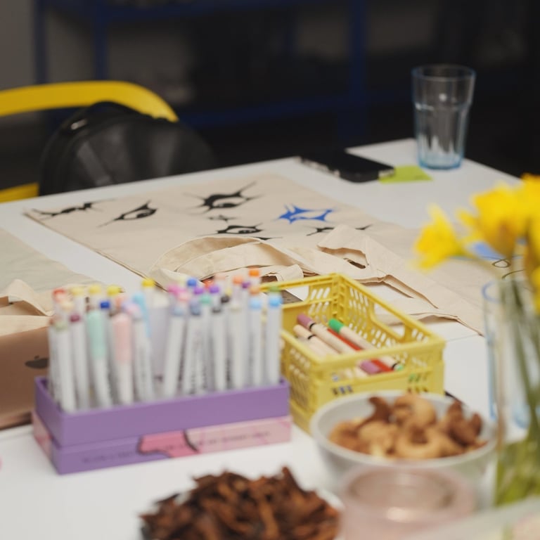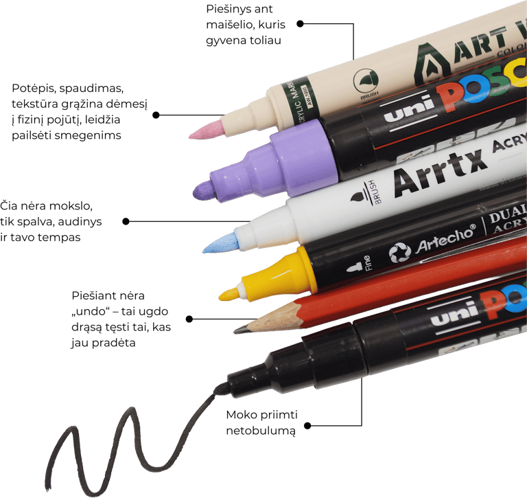 Būrelio metu piešiame akriliniais markeriais. Spalvos ryškios, linijos aiškios, o piešiniai atsparūs naudojimui: atsargiai skalbiant jie nenusiskalbia ir ilgai išlieka. Tai leidžia piešti drąsiai, žinant, kad rezultatas neliks tik akimirksniui.